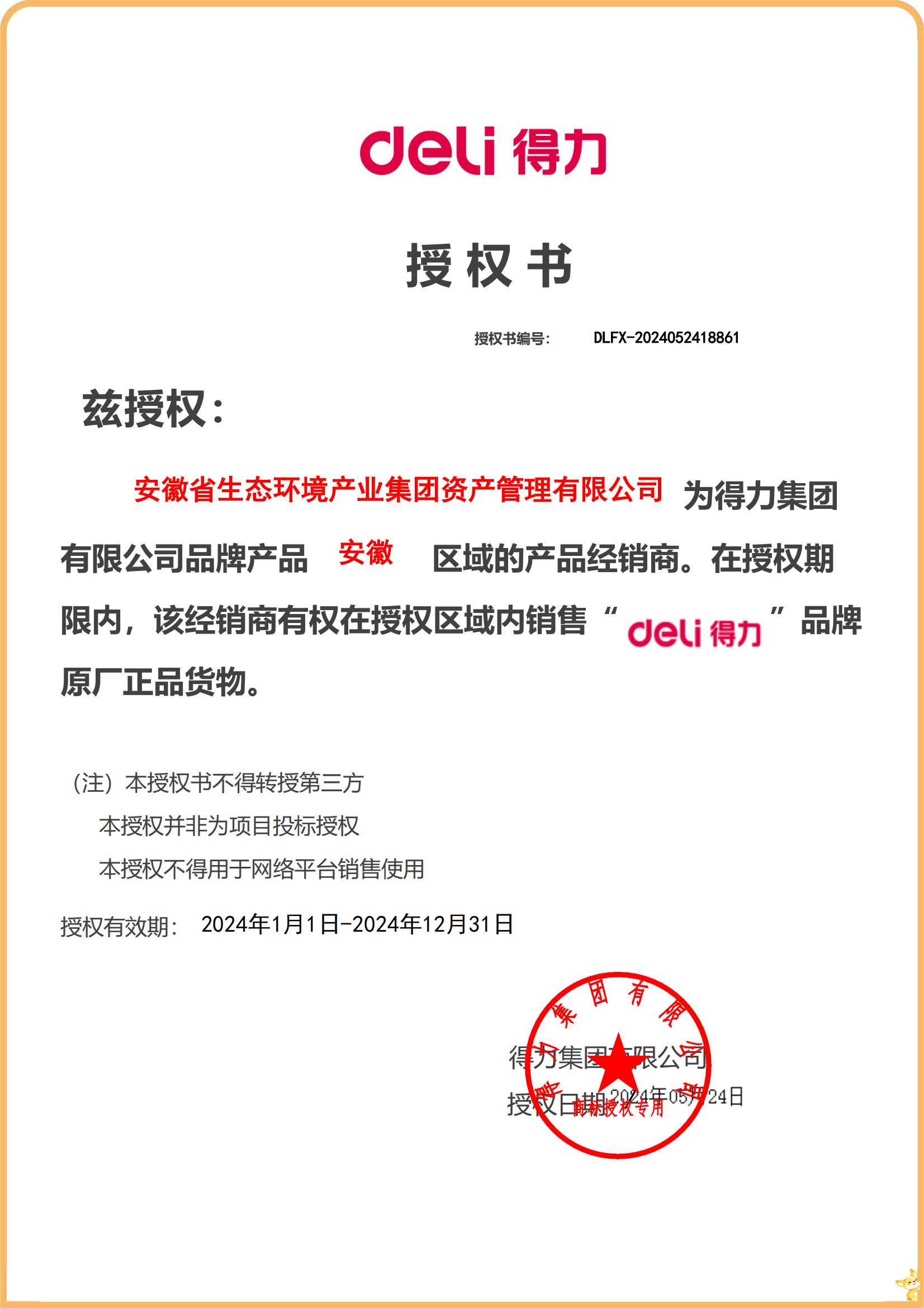 經(jīng)過(guò)不懈努力,5月24日,省生態(tài)環(huán)境產(chǎn)業(yè)集團(tuán)資產(chǎn)管理公司獲得中國(guó)最大的辦公與學(xué)習(xí)用品產(chǎn)業(yè)集團(tuán)即得力集團(tuán)的官方授權(quán)。